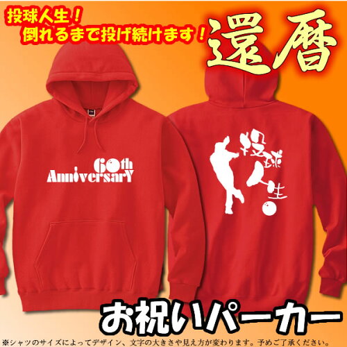 お祝いパーカー◆還暦パーカー(赤) 『投球人生(60th Anniversary)』 まだまだ現役!ボウリングを嗜んでいる方へ!■お祝いパーカー ■還暦パーカー(赤) ■投球人生(60th Anniversary) ■綿100% ■サイズ S〜XL(サイズ表参照) ■文字色・柄色選択可(ゴールド・シルバー・イエロー・ホワイト) ■納期は注文確定から約5営業日(1週間)です。